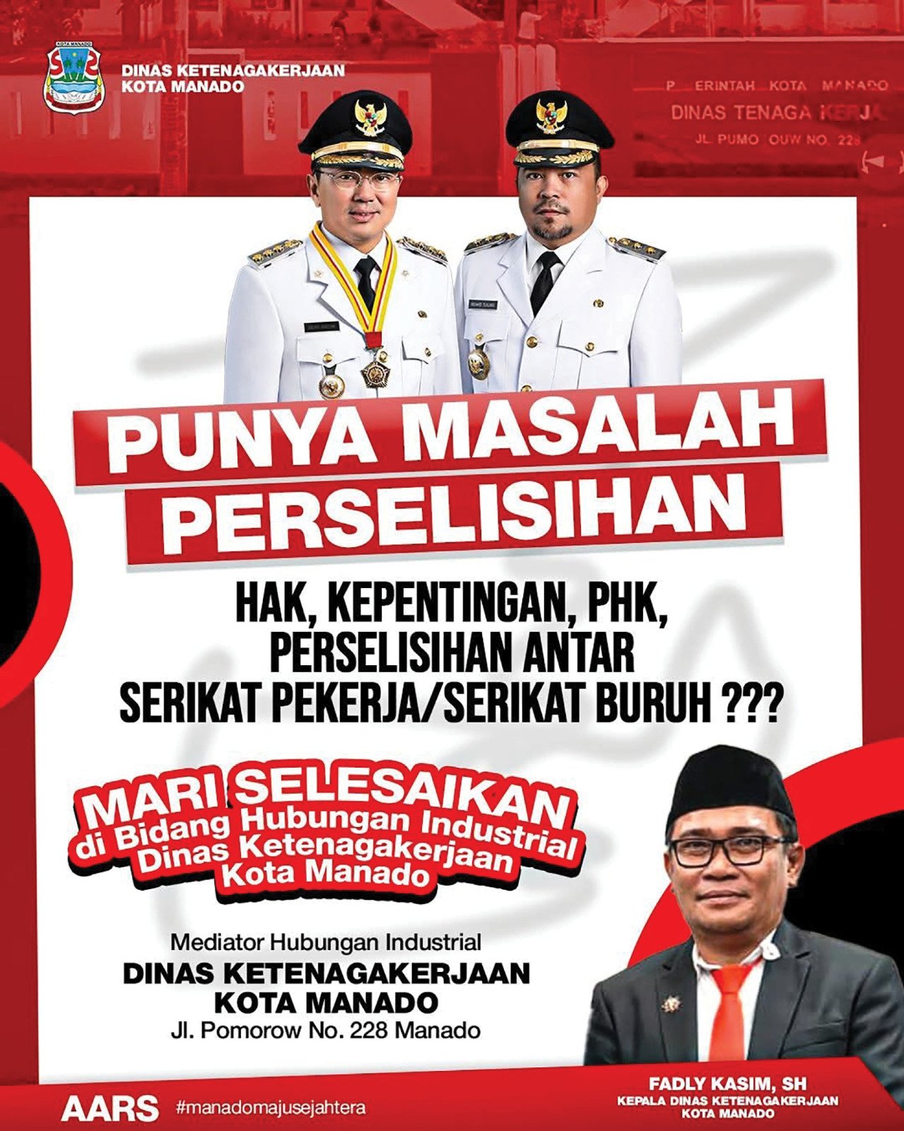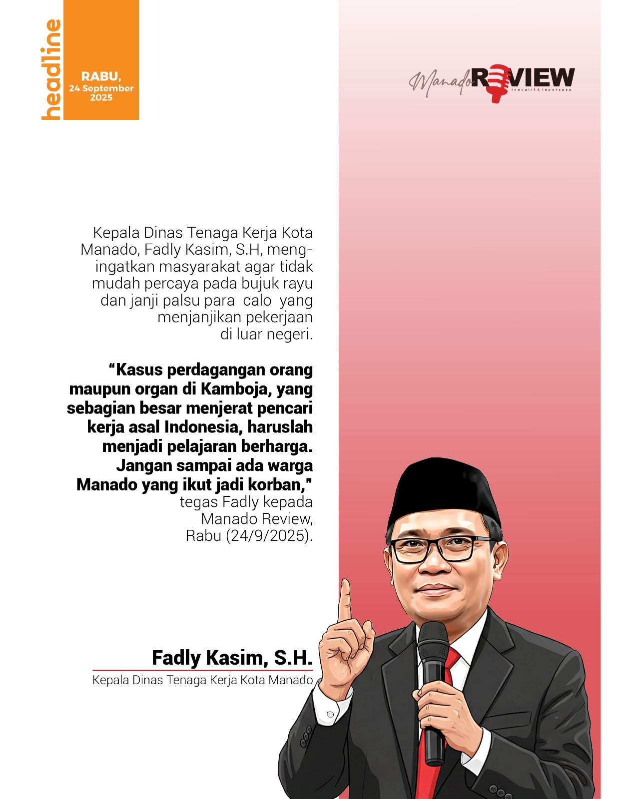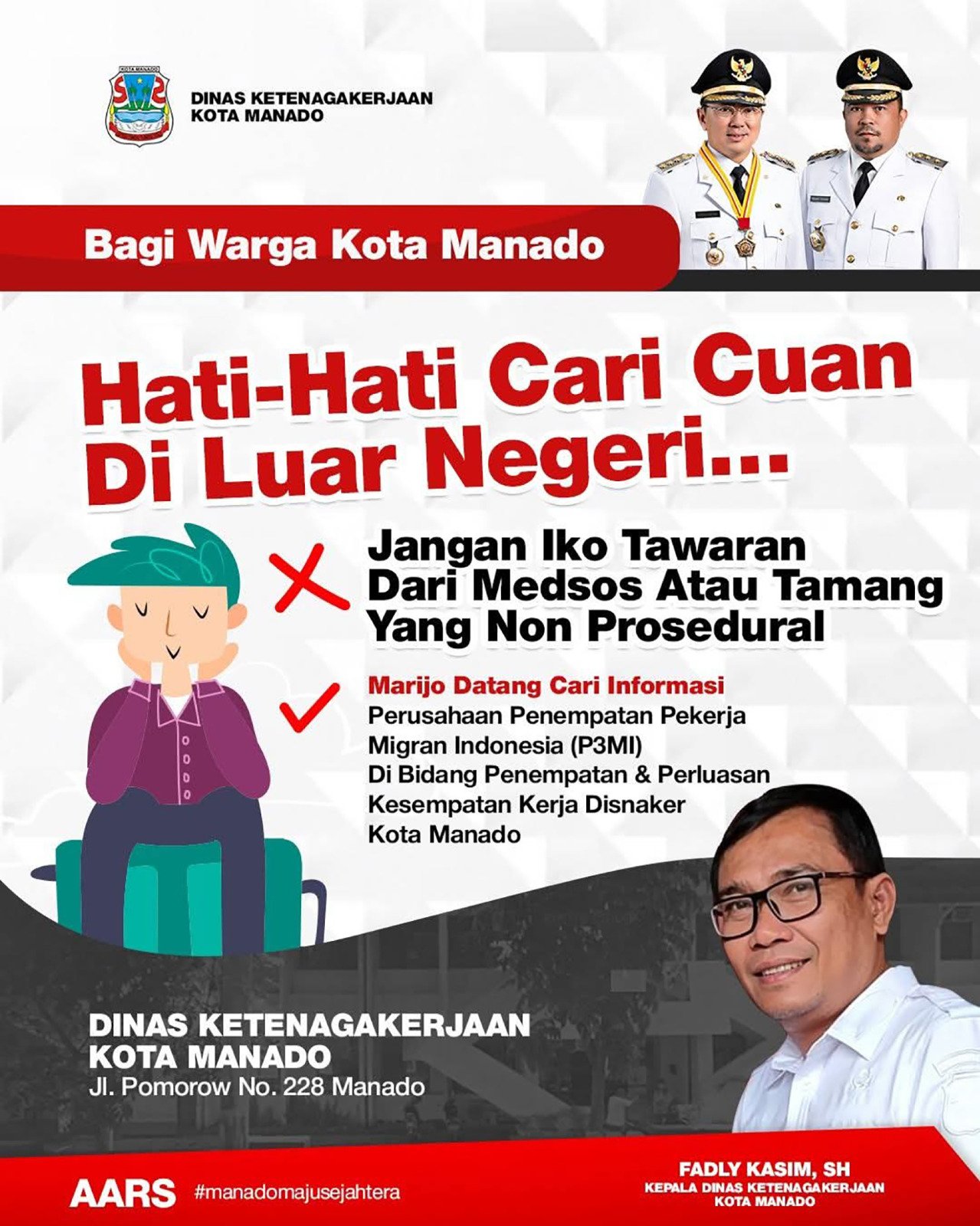 Kepala Dinas Tenaga Kerja Kota Manado, Fadly Kasim, S.H, mengingatkan masyarakat agar tidak mudah percaya pada bujuk rayu dan janji palsu para calo yang menjanjikan pekerjaan di luar negeri.