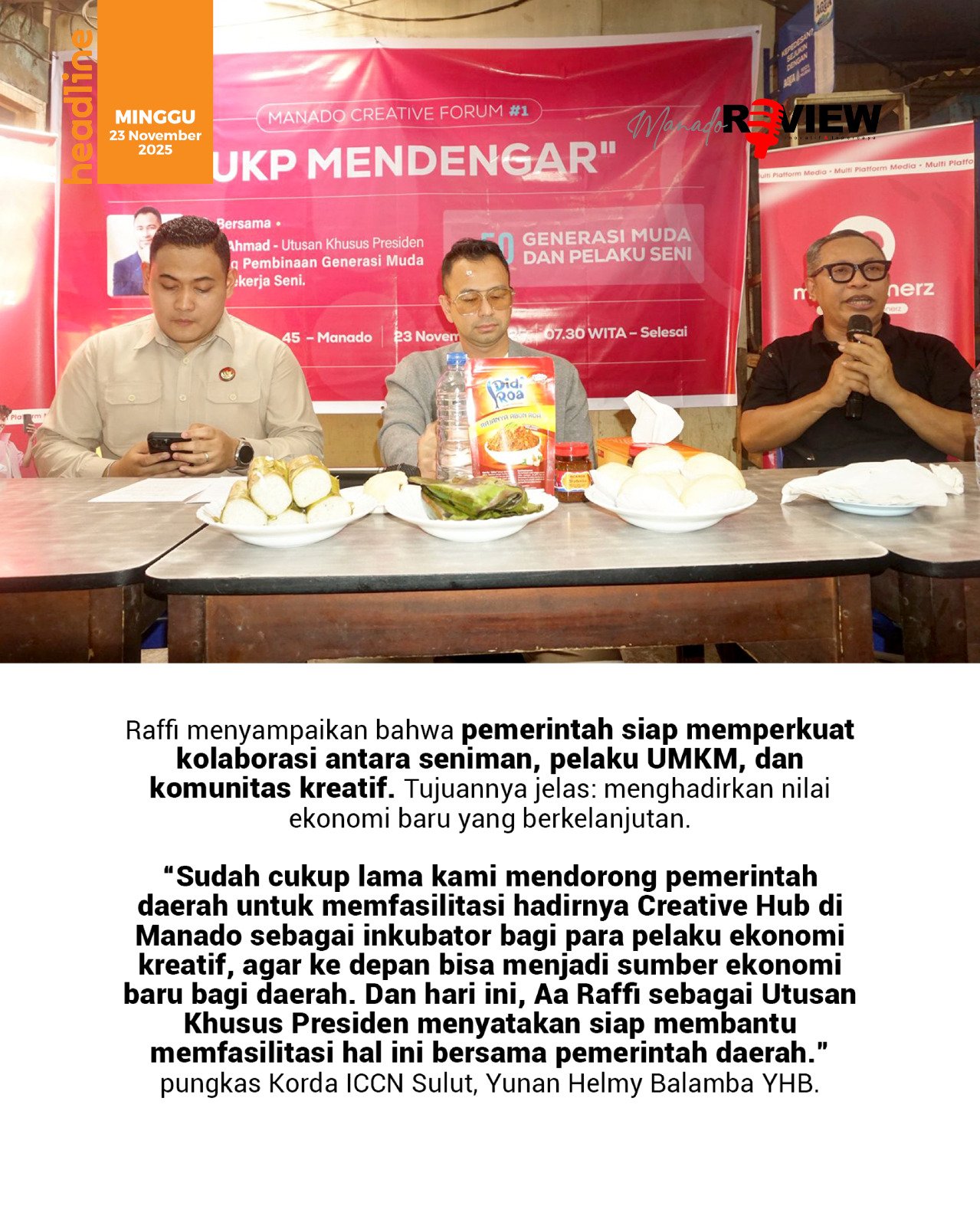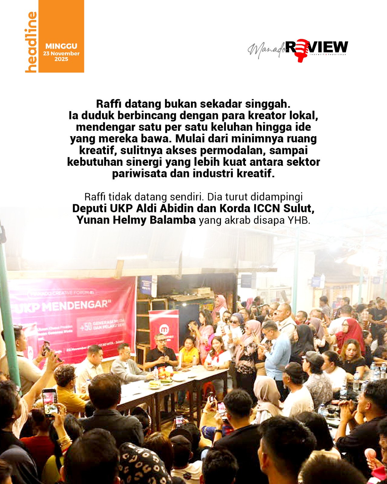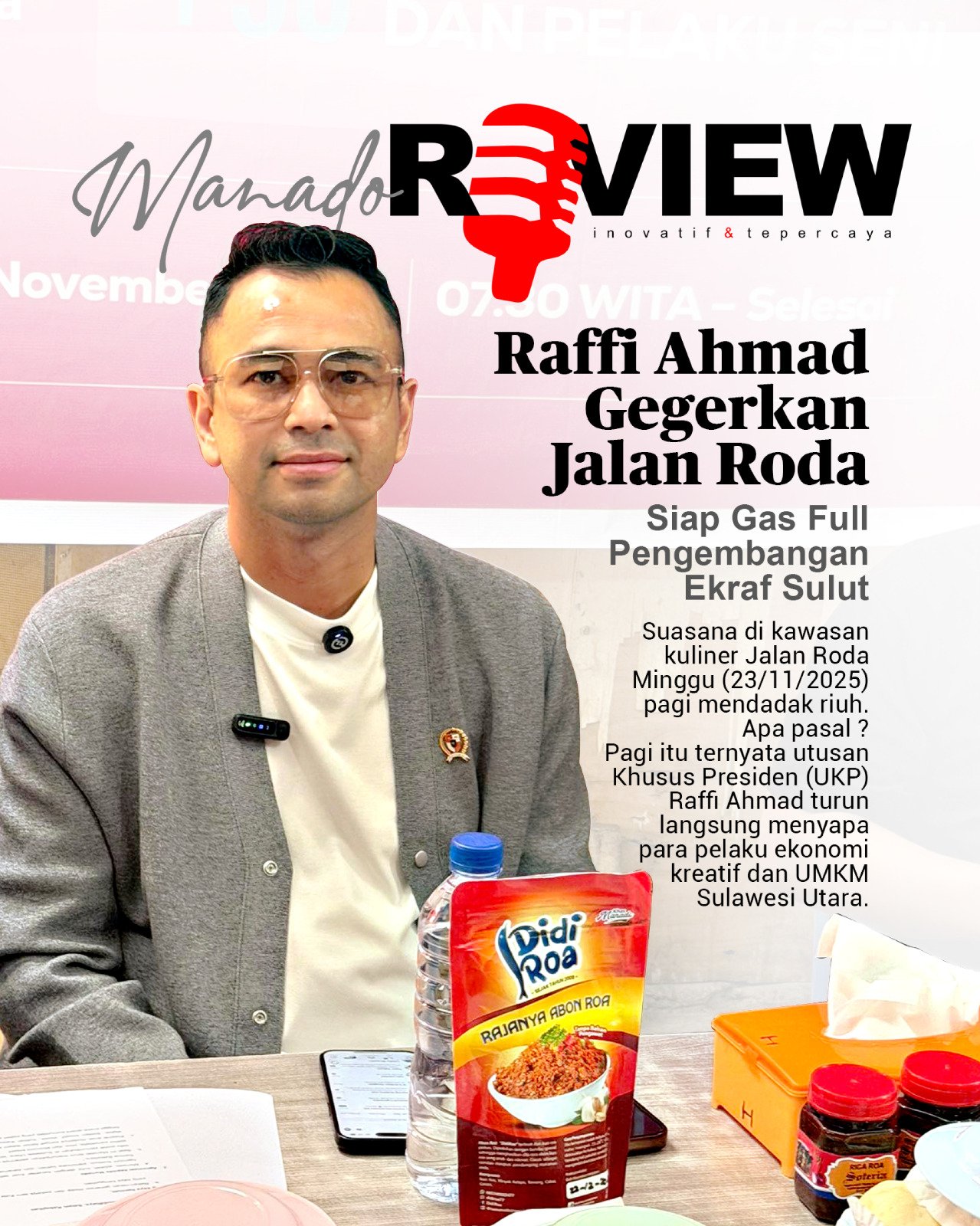 Pagi itu ternyata utusan Khusus Presiden (UKP) Raffi Ahmad turun langsung menyapa para pelaku ekonomi kreatif dan UMKM Sulawesi Utara. Agenda tersebut digelar atas undangan Korda Sulut Indonesia Creative Cities Network (ICCN) Yunan Helmy Balamba (YHB).